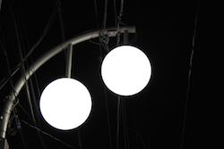 その昔、天に憧れた白線たちがいた。その思いは日を重ねるごとに増していき、ついに地から離れてしまった。天へと登ってゆく姿を見た神はそれを良しとされず、真っすぐと伸びる白線を曲げてしまった。白線はあまりの悲しみに大粒の涙を2つ流し、そのまま固まってしまった。そうして白線は固まった姿のまま今に至り、固まった大粒の涙は夜になるとまるで陽が登っているかのような光を放し、私たちの夜道を明るく照らす。 <ナカムラ>
